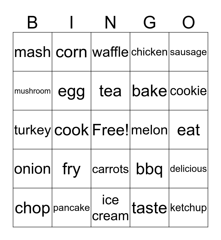 This bingo card has a free space and 24 words: fry, pancake, tea, chop, sausage, mash, mushroom, corn, melon, carrots, bake, turkey, bbq, delicious, egg, taste, eat, waffle, cookie, cook, ketchup, onion, chicken and ice cream.