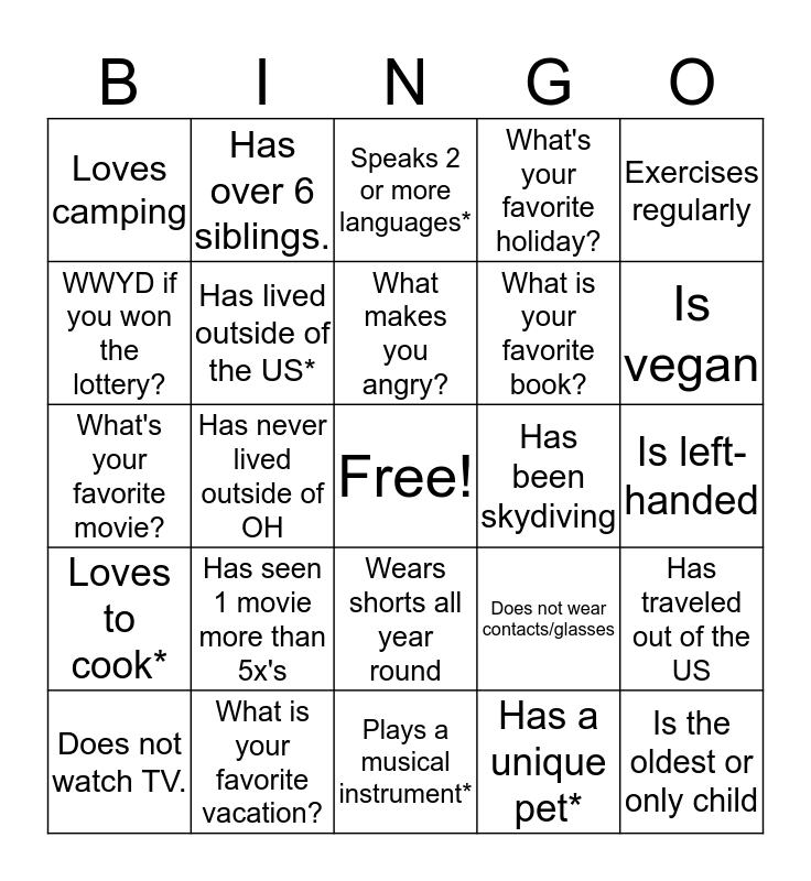 This bingo card has a free space and 31 words: Plays a musical instrument*, Wears contact lenses, Has never lived outside of OH, Is a twin or has twin siblings., Loves camping, Speaks 2 or more languages*, Has lived outside of the US*, Does not wear contacts/glasses, Has been skydiving, Has a unique pet*, Is left-handed, Is the oldest or only child, Has 2 or more pets*, Is not on any social media, Is vegan, Can tell a bad joke*, Has traveled out of the US, Has seen 1 movie more than 5x's, Loves to cook*, Wears shorts all year round, Exercises regularly, Will admit to singing in their car, Does not watch TV., Has over 6 siblings., What is your favorite book?, WWYD if you won the lottery?, What's your favorite holiday?, What's your favorite movie?, What is your favorite vacation?, What makes you angry? and How many pairs of shoes do you own?.