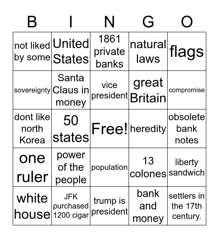This bingo card has a free space and 24 words: power of the people, JFK purchased 1200 cigar, vice president, white house, flags, not liked by some, sovereignty, United States, heredity, population, great Britain, dont like north Korea, 13 colones, liberty sandwich, Santa Claus in money, bank and money, obsolete bank notes, 1861 private banks, compromise, 50 states, settlers in the 17th century., one ruler, natural laws and trump is president.