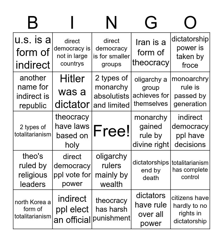 This bingo card has a free space and 24 words: direct democracy ppl vote for power, indirect ppl elect an official, 2 types of monarchy absolutists and limited, north Korea a form of totalitarianism, dictatorship power is taken by froce, u.s. is a form of indirect, another name for indirect is republic, direct democracy is not in large countrys, monarchy gained rule by divine right, oligarchy rulers mainly by wealth, oligarchy a group achieves for themselves, 2 types of totalitarianism, dictatorships end by death, totalitarianism has complete control, Hitler was a dictator, dictators have rule over all power, indirect democracy ppl have decisions, direct democracy is for smaller groups, monoarchry rule is passed by generation, theocracy have laws based on holy, citizens have hardly to no rights in dictatorship, theo's ruled by religious leaders, Iran is a form of theocracy and theocracy has harsh punishment.