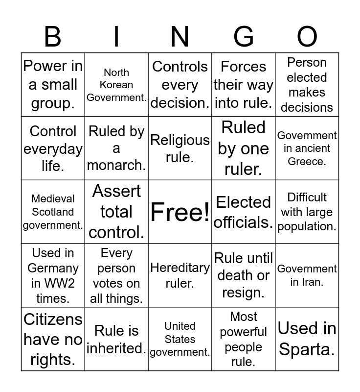 This bingo card has a free space and 24 words: Every person votes on all things., Rule is inherited., Religious rule., Citizens have no rights., Person elected makes decisions, Power in a small group., Control everyday life., North Korean Government., Elected officials., Hereditary ruler., Ruled by one ruler., Medieval Scotland government., Rule until death or resign., Government in Iran., Ruled by a monarch., Most powerful people rule., Difficult with large population., Controls every decision., Government in ancient Greece., Assert total control., Used in Sparta., Used in Germany in WW2 times., Forces their way into rule. and United States government..
