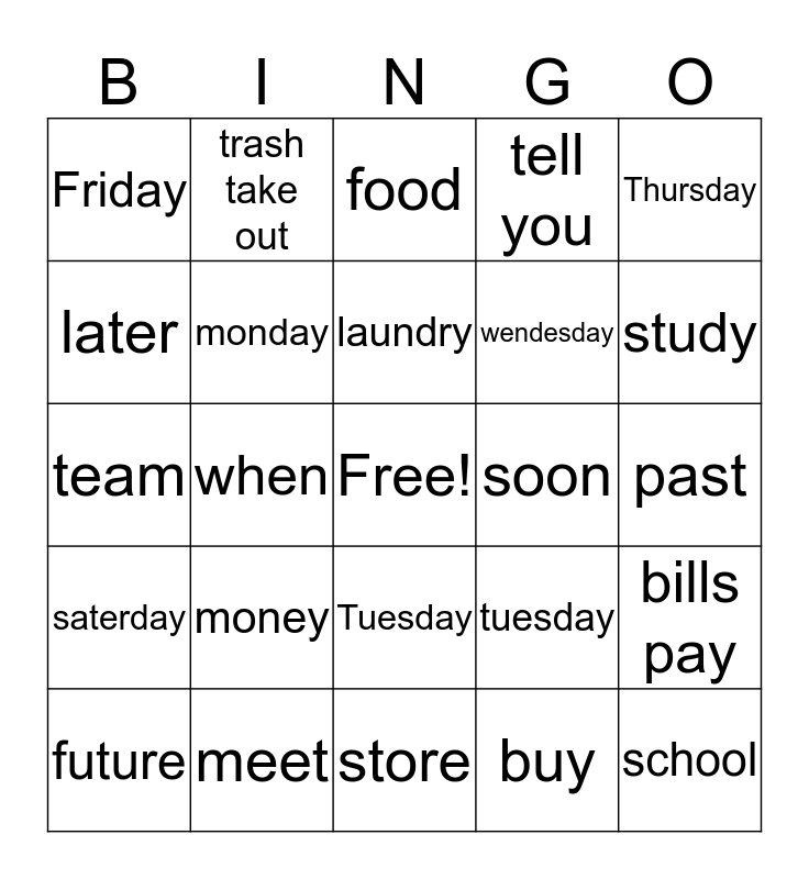 This bingo card has a free space and 29 words: future, soccer, when, see, Friday, food, monday, money, soon, meet, past, school, store, buy, study, now, Tuesday, saterday, Thursday, team, tuesday, sunday, wendesday, later, tell you, trash take out, bills pay, laundry and take care of.