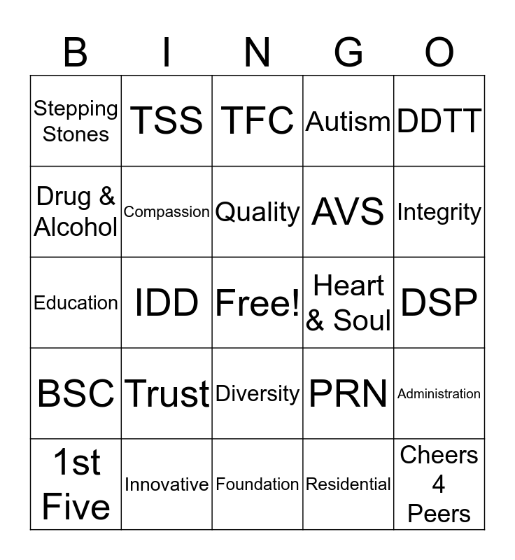 This bingo card has a free space and 28 words: Administration, BHRS, AVS, Residential, Drug & Alcohol, TFC, TSS, BSC, Heart & Soul, 1st Five, Education, Autism, Innovative, Foundation, Integrity, Safety, Trust, Compassion, Quality, Diversity, Stepping Stones, 50 Years, Cheers 4 Peers, IDD, DSP, PRN, DDTT and BHRS.