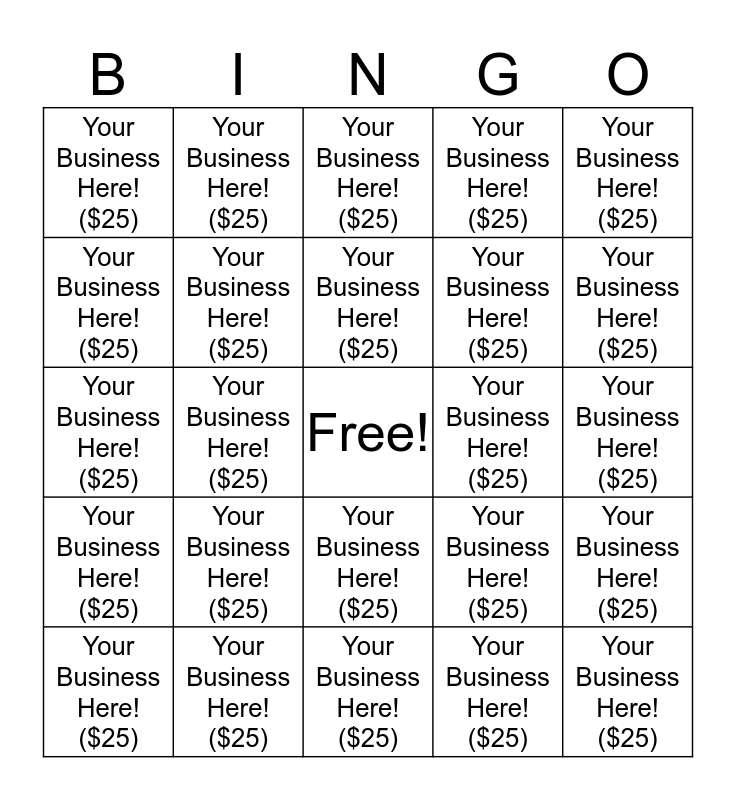 This bingo card has a free space and 24 words: Your Business Here!($25), Your Business Here!($25), Your Business Here!($25), Your Business Here!($25), Your Business Here!($25), Your Business Here!($25), Your Business Here!($25), Your Business Here!($25), Your Business Here!($25), Your Business Here!($25), Your Business Here!($25), Your Business Here!($25), Your Business Here!($25), Your Business Here!($25), Your Business Here!($25), Your Business Here!($25), Your Business Here!($25), Your Business Here!($25), Your Business Here!($25), Your Business Here!($25), Your Business Here!($25), Your Business Here!($25), Your Business Here!($25) and Your Business Here!($25).
