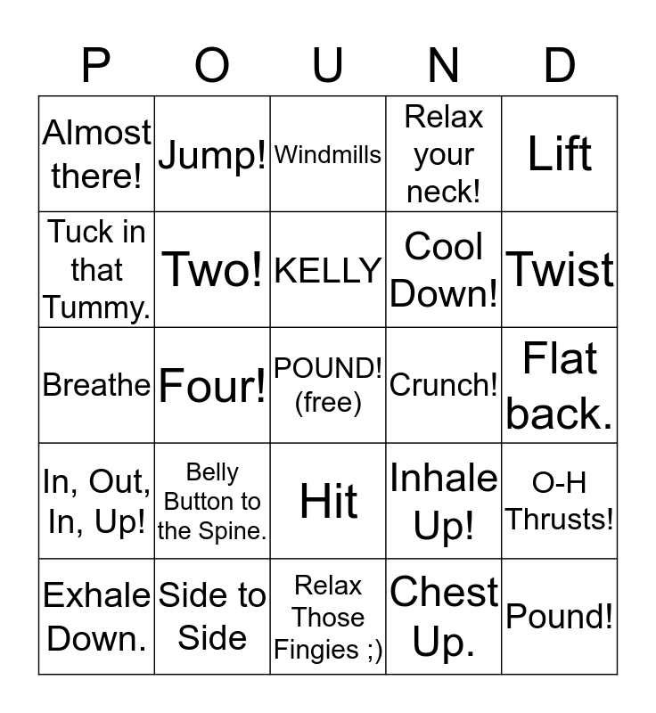 This bingo card has a free space and 27 words: Inhale Up!, Feet, Shoulder Width A Part., Cool Down!, Relax Those Fingies ;), Tuck in that Tummy., Windmills, Jump!, In, Out, In, Up!, Crunch!, O-H Thrusts!, Breathe, Relax your neck!, Exhale Down., Side to Side, Twist, Pulse, Two!, KELLY, Belly Button to the Spine., Almost there!, Flat back., Chest Up., Four!, Pound!, Hit, Lift and Drop.