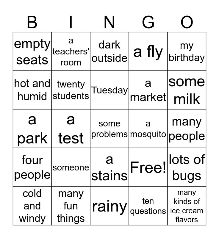 This bingo card has 25 words: someone, rainy, Tuesday, cold and windy, my birthday, empty seats, hot and humid, a teachers' room, a mosquito, a stains, a market, a park, Free!, lots of bugs, twenty students, many kinds of ice cream flavors, many people, dark outside, some milk, a test, some problems, many fun things, four people, a fly and ten questions.