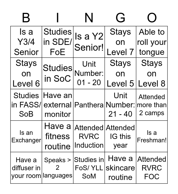 This bingo card has a free space and 24 words: Have a fitness routine, Speaks > 2 languages, Unit Number: 01 - 20, Have a diffuser in your room, Able to roll your tongue, Is a Y3/4 Senior, Stays on Level 6, Studies in SDE/ FoE, Unit Number: 21 - 40, Attended RVRC Induction, Stays on Level 5, Studies in FASS/ SoB, Attended IG this year, Is a Freshman!, Studies in SoC, Have a skincare routine, Attended more than 2 camps, Is a Y2 Senior!, Stays on Level 8, Have an external monitor, Attended RVRC FOC, Is an Exchanger, Stays on Level 7 and Studies in FoS/ YLL SoM.