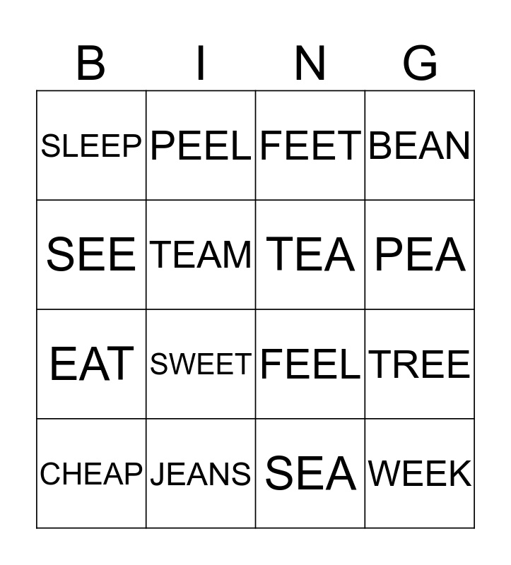 This bingo card has 16 words: JEANS, TREE, FEET, SLEEP, EAT, PEEL, FEEL, SEA, SEE, TEAM, CHEAP, BEAN, SWEET, PEA, TEA and WEEK.
