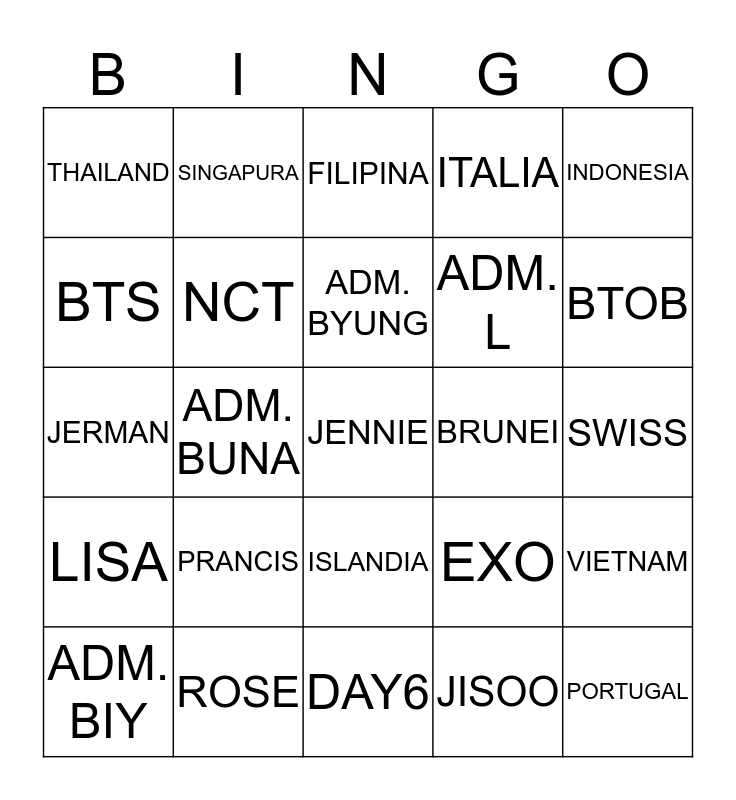 This bingo card has 25 words: LISA, ROSE, JENNIE, JISOO, INDONESIA, THAILAND, SINGAPURA, FILIPINA, BRUNEI, VIETNAM, BTS, NCT, DAY6, EXO, BTOB, ADM. BIY, ADM. BUNA, ADM. BYUNG, ADM. L, SWISS, JERMAN, PRANCIS, ISLANDIA, ITALIA and PORTUGAL.