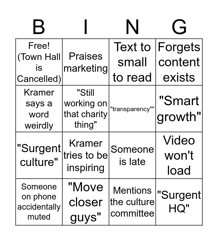This bingo card has 16 words: Someone on phone accidentally muted, "Move closer guys", Text to small to read, Forgets content exists, Kramer says a word weirdly, Praises marketing, Someone is late, Video won't load, Free! (Town Hall is Cancelled), "Still working on that charity thing", Mentions the culture committee, "Smart growth", "Surgent culture", Kramer tries to be inspiring, "transparency"" and "Surgent HQ".