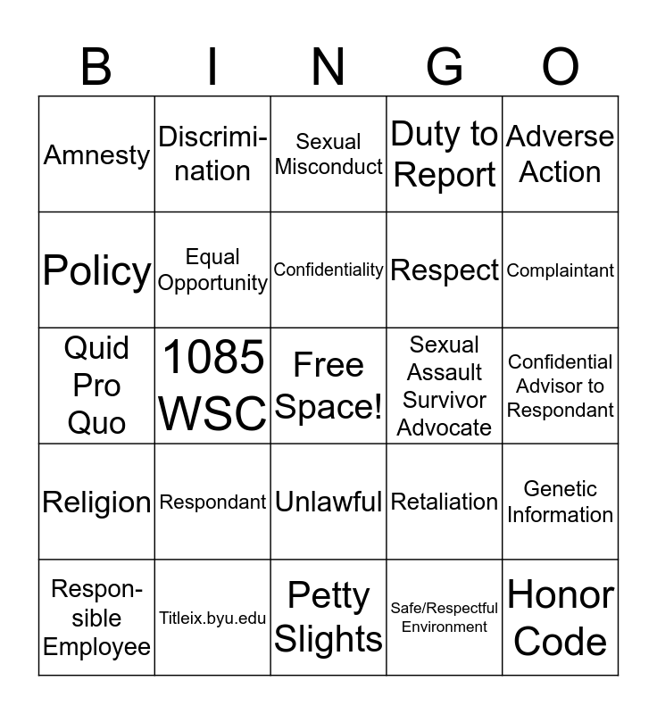 This bingo card has a free space and 28 words: Genetic Information, Gender Discrimi-nation, Respect, Safe/Respectful Environment, Policy, Sexual Misconduct, Discrimi-nation, Religion, Sexual Assault Survivor Advocate, Respon-sible Employee, Quid Pro Quo, Duty to Report, Titleix.byu.edu, Petty Slights, Complaintant, Harass-ment, Respondant, Equal Opportunity, Confidentiality, Unlawful, Amnesty, 400%, Honor Code, 1085 WSC, Confidential Advisor to Respondant, Retaliation, Adverse Action and President Worthen Quote.
