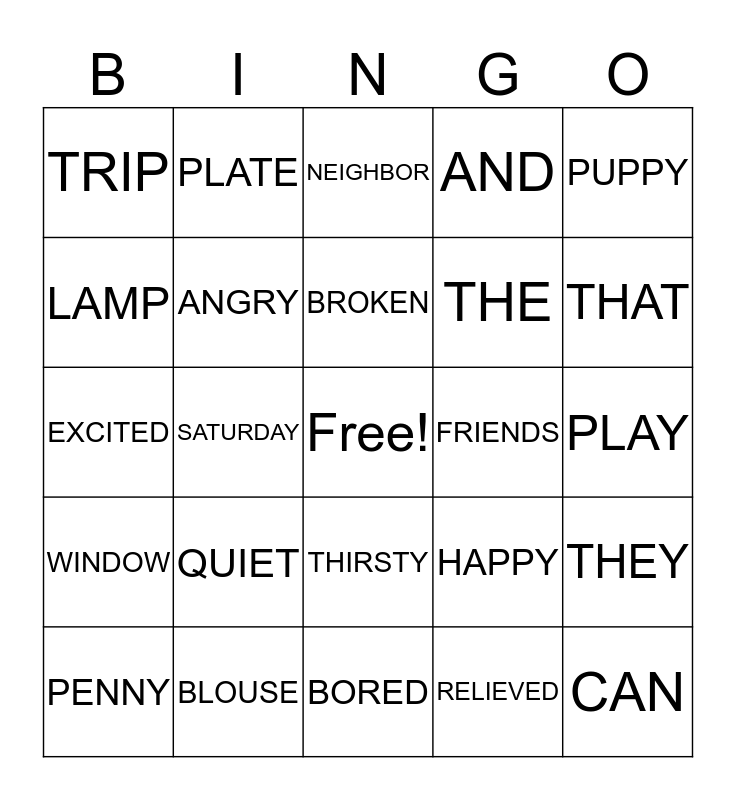 This bingo card has a free space and 24 words: PENNY, QUIET, BROKEN, RELIEVED, PUPPY, TRIP, PLATE, NEIGHBOR, FRIENDS, PLAY, EXCITED, ANGRY, HAPPY, THEY, LAMP, BLOUSE, BORED, AND, THAT, WINDOW, SATURDAY, THIRSTY, THE and CAN.