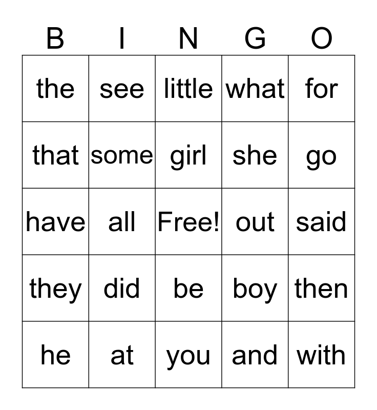 This bingo card has a free space and 37 words: not, like, this, some, then, did, girl, can, for, but, all, what, with, said, that, they, down, little, be, out, the, go, he, you, has, and, see, we, of, am, is, at, have, to, boy, she and look.