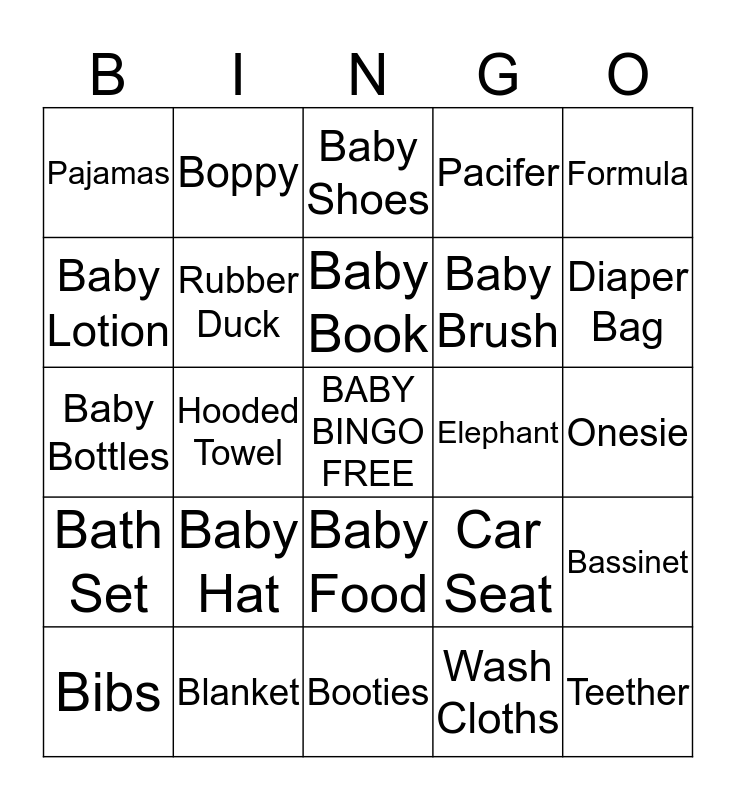 This bingo card has a free space and 27 words: Car Seat, Diapers, Baby Brush, Booties, Baby Lotion, Baby Shoes, Boppy, Bath Set, Elephant, Bassinet, Baby Bottles, Pacifer, Bibs, Blanket, Diaper Bag, Baby Shirt, Rubber Duck, Baby Book, Baby Hat, Pajamas, Onesie, Wash Cloths, Hooded Towel, Teether, Baby Food, Formula and Baby Toy.