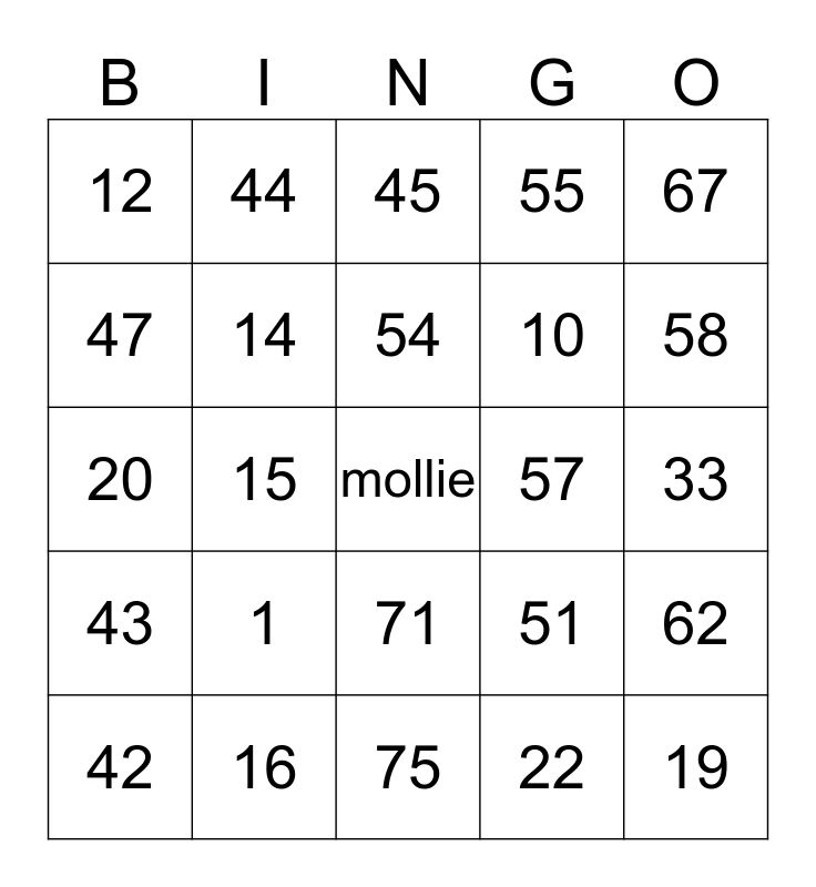 This bingo card has a free space and 24 words: 1, 16, 54, 42, 67, 12, 47, 44, 57, 71, 10, 20, 51, 62, 14, 22, 33, 45, 58, 15, 19, 43, 55 and 75.