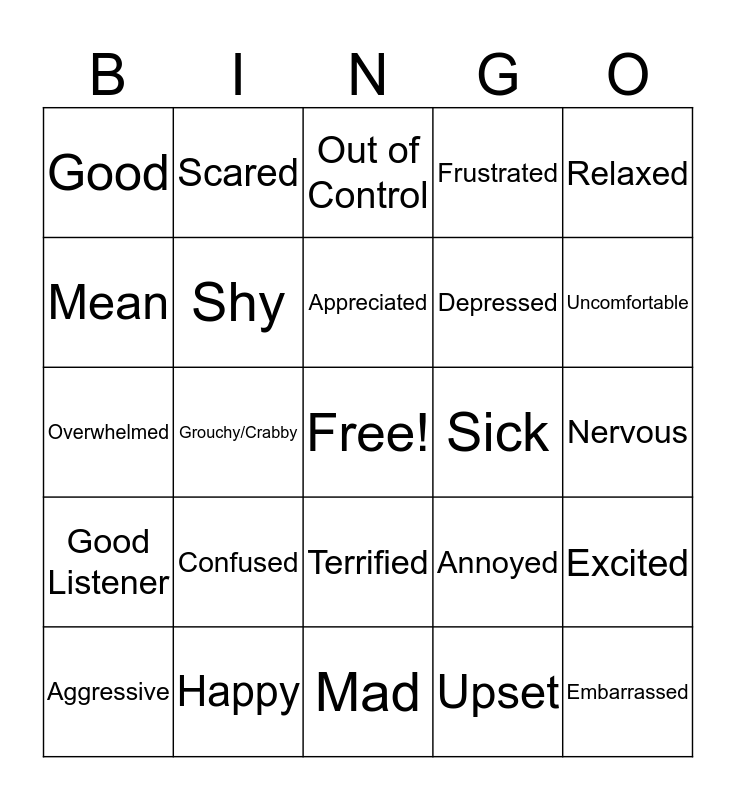 This bingo card has a free space and 42 words: Silly, Appreciated, Okay, Confused, Upset, Excited, Embarrassed, Anxious/Worried, Out of Control, Terrified, Nervous, Uncomfortable, Grouchy/Crabby, Relaxed, Sad, Annoyed, Jealous, Overwhelmed, Calm, Scared, Mean, Thankful, Ready to learn, Good, Focused, Content, Depressed, Hurt, Bored, Tired, Exhausted, Good Listener, Shy, Mad, Yelling, Aggressive, Happy, Sick, Elated, Angry, Frustrated and Proud.