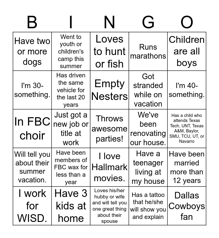 This bingo card has a free space and 24 words: Have been members of FBC wax for less than a year, Have 3 kids at home, Empty Nesters, I work for WISD., Children are all boys, Have two or more dogs, I'm 30-something., Went to youth or children's camp this summer, We've been renovating our house., I love Hallmark movies., Got stranded while on vacation, In FBC choir, Have a teenager living at my house, Have been married more than 12 years, Has driven the same vehicle for the last 20 years, Has a tattoo that he/she will show you and explain, Has a child who attends Texas Tech, UNT, Texas A&M, Baylor, SMU, TCU, UT, or Navarro, Loves to hunt or fish, I'm 40-something., Just got a new job or title at work, Dallas Cowboys fan, Will tell you about their summer vacation., Runs marathons and Loves his/her hubby or wife and will tell you one great thing about their spouse.