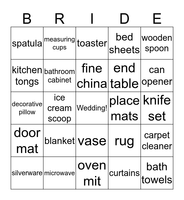 This bingo card has a free space and 45 words: pots and pans, bath towels, dish towels, silverware, picture frame, curtains, toaster, blender, wooden spoon, microwave, bed sheets, place mats, vase, blanket, toaster oven, oven mit, bath mat, decorative pillow, crock pot, can opener, measuring cups, cookie sheet, mixing bowl, spatula, whisk, knife set, dustpan, broom, rug, door mat, vacuum, carpet cleaner, duster, pillowcase, washcloth, ice cream scoop, cake pan, paper towel holder coasters, pizza pan, fine china, kitchen tongs, end table, garbage can, bathroom cabinet and hamper.