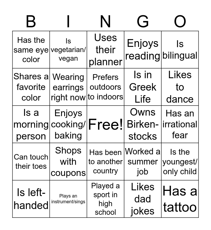 This bingo card has a free space and 24 words: Shops with coupons, Plays an instrument/sings, Prefers outdoors to indoors, Is left-handed, Is bilingual, Has the same eye color, Shares a favorite color, Is vegetarian/ vegan, Owns Birken-stocks, Has been to another country, Is in Greek Life, Is a morning person, Worked a summer job, Is the youngest/ only child, Wearing earrings right now, Likes dad jokes, Has an irrational fear, Uses their planner, Likes to dance, Enjoys cooking/ baking, Has a tattoo, Can touch their toes, Enjoys reading and Played a sport in high school.