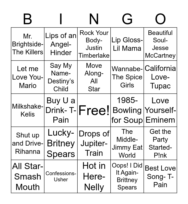 This bingo card has a free space and 25 words: Lucky- Britney Spears, Hot in Here- Nelly, Move Along- All Star, All Star- Smash Mouth, Beautiful Soul- Jesse McCartney, Mr. Brightside- The Killers, Let me Love You- Mario, Lips of an Angel- Hinder, 1985- Bowling for Soup, Drops of Jupiter- Train, Wannabe- The Spice Girls, Milkshake- Kelis, The Middle- Jimmy Eat World, Get the Party Started- P!nk, Say My Name- Destiny’s Child, Work it- Missy Elliot, Love Yourself- Eminem, Rock Your Body- Justin Timberlake, California Love- Tupac, Buy U a Drink- T-Pain, Best Love Song- T-Pain, Confessions- Usher, Shut up and Drive- Rihanna, Lip Gloss- Lil Mama and Oops! I Did It Again- Brittney Spears.