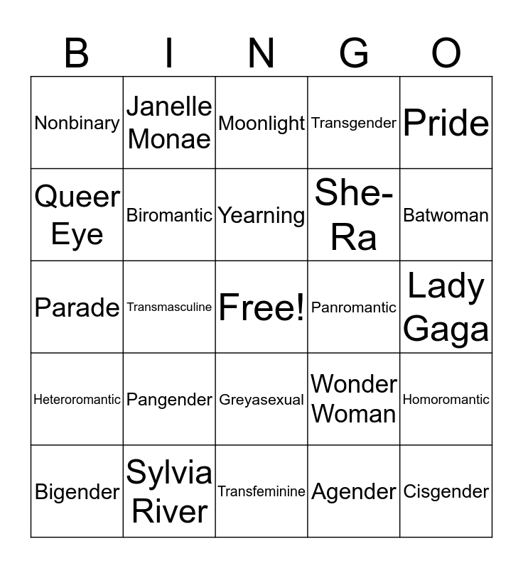This bingo card has a free space and 48 words: Marsha P. Johnson, Sylvia River, Freddie Mercury, Ezra Miller, Lady Gaga, RuPaul Charles, Janelle Monae, Oscar Wilde, Transgender, Cisgender, Nonbinary, Transmasculine, Transfeminine, Agender, Demigender, Bigender, Pangender, Yearning, Sapphic, Pride, Parade, keysmash, Moonlight, She-Ra, Sense8, Queer Eye, Steven Universe, Pose, Wonder Woman, Batwoman, RENT, Call Me By Your Name, Homosexual, Heterosexual, Bisexual, Asexual, Pansexual, Demisexual, Greyasexual, Polysexual, Homoromantic, Heteroromantic, Biromantic, Aromantic, Panromantic, Demiromantic, Greyaromantic and Polyromantic.