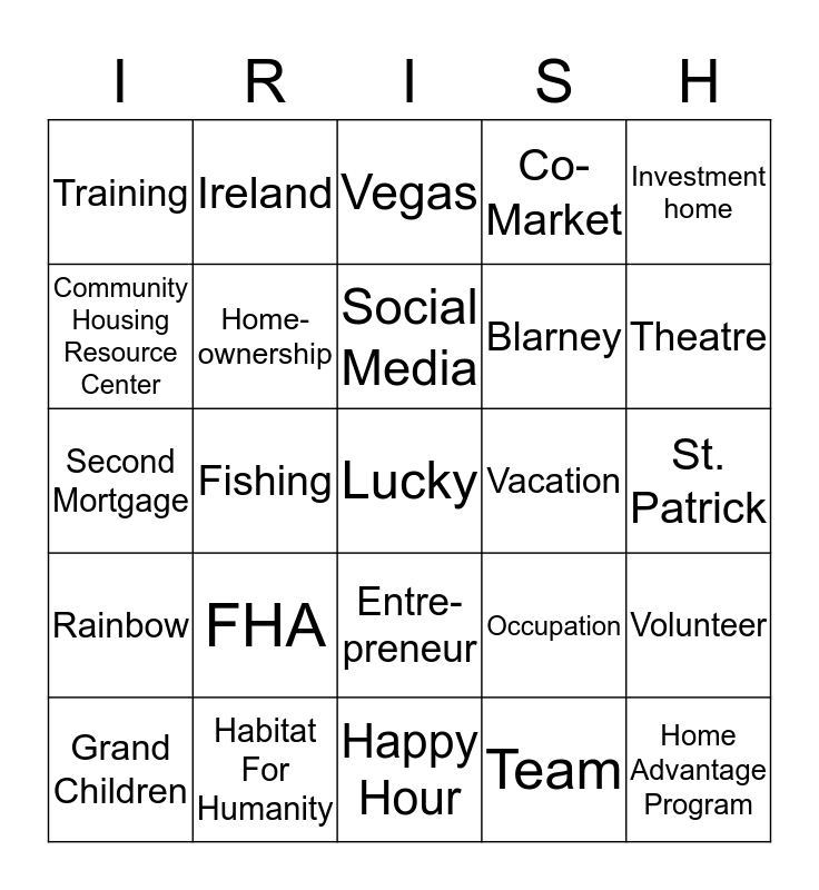This bingo card has a free space and 24 words: FHA, Habitat For Humanity, Social Media, Grand Children, Investment home, Training, Community Housing Resource Center, Ireland, Vacation, Entre-preneur, Blarney, Second Mortgage, Occupation, Volunteer, Home- ownership, Team, St. Patrick, Vegas, Theatre, Fishing, Home Advantage Program, Rainbow, Co-Market and Happy Hour.