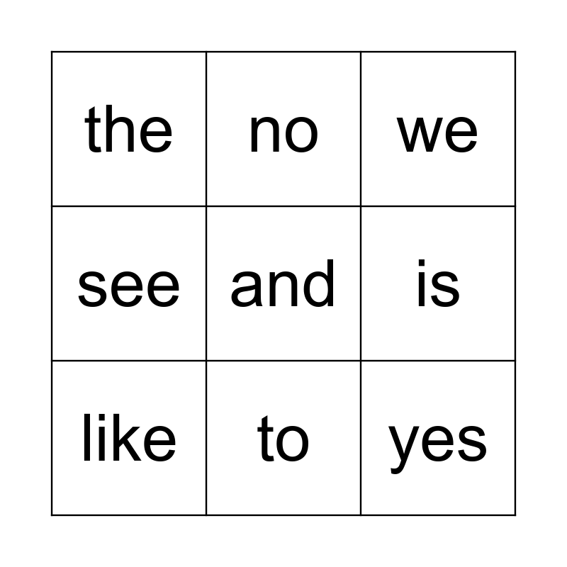 This bingo card has a free space and 17 words: I, can, we, the, go, see, a, like, to, is, on, am, yes, no, boy, girl and at.