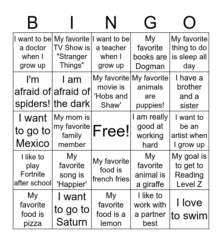 This bingo card has a free space and 24 words: My favorite song is 'Happier', I want to go to Saturn, My favorite movie is 'Hobs and Shaw', My favorite food is pizza, My favorite thing to do is sleep all day, I want to be a doctor when I grow up, I'm afraid of spiders!, My favorite TV Show is "Stranger Things", I am really good at working hard, My favorite food is french fries, My favorite animals are puppies!, I want to go to Mexico, My favorite animal is a giraffe, My goal is to get to Reading Level Z, I am afraid of the dark, I like to work with a partner best, I want to be an artist when I grow up, I want to be a teacher when I grow up, I have a brother and a sister, My mom is my favorite family member, I love to swim, I like to play Fortnite after school, My favorite books are Dogman and My favorite food is a lemon.