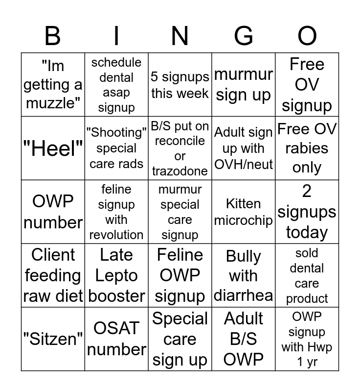 This bingo card has a free space and 29 words: "Sitzen", "What does my insurance cover", feline signup with revolution, "How much for just rabies", "Im getting a muzzle", 5 signups this week, "Shooting" special care rads, Late Lepto booster, Kitten microchip, OSAT number, 2 signups today, OWP signup with Hwp 1 yr, Special care sign up, Adult B/S OWP, Free OV rabies only, Puppy microchip, Feline OWP signup, Client feeding raw diet, Free OV signup, OWP number, Bully with diarrhea, Canine OWP signup, Adult sign up with OVH/neut, "Heel", murmur sign up, schedule dental asap signup, sold dental care product, B/S put on reconcile or trazodone and canine instate health certificate.