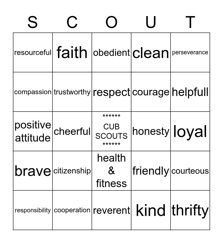 This bingo card has a free space and 24 words: citizenship, cooperation, respect, responsibility, perseverance, resourceful, compassion, faith, honesty, health & fitness, courage, positive attitude, friendly, courteous, trustworthy, kind, loyal, obedient, helpfull, cheerful, thrifty, brave, clean and reverent.