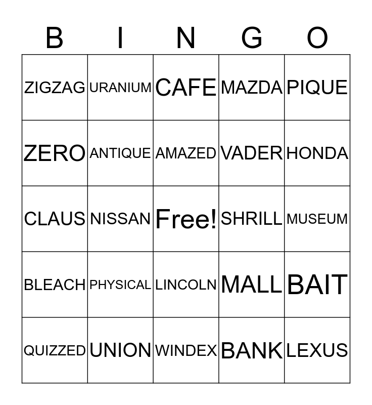 This bingo card has a free space and 24 words: PHYSICAL, UNION, AMAZED, QUIZZED, PIQUE, ZIGZAG, ZERO, URANIUM, SHRILL, LINCOLN, VADER, CLAUS, MALL, BAIT, ANTIQUE, BANK, MUSEUM, CAFE, HONDA, NISSAN, LEXUS, BLEACH, MAZDA and WINDEX.