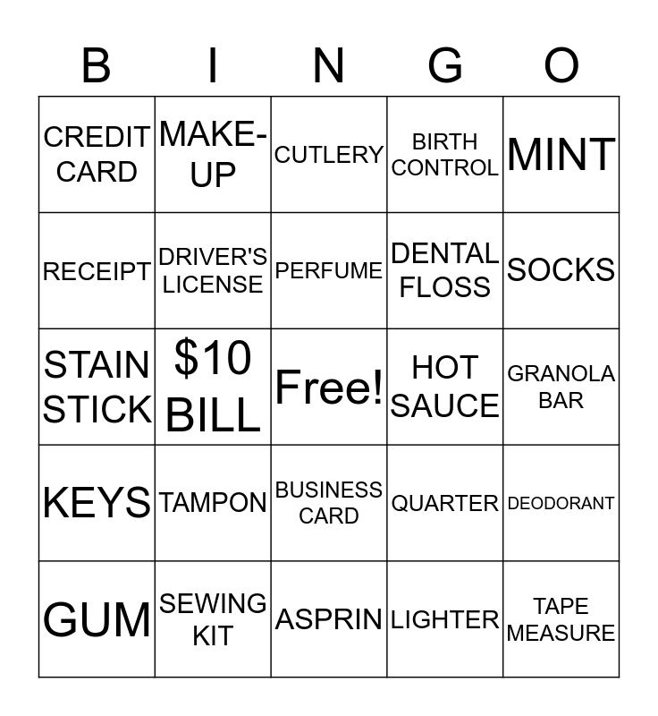 This bingo card has a free space and 29 words: GUM, BOBBY PIN, $10 BILL, CHAP-STICK, CREDIT CARD, CUTLERY, DRIVER'S LICENSE, TAMPON, HOT SAUCE, SEWING KIT, GRANOLA BAR, TAPE MEASURE, ASPRIN, LIGHTER, SOCKS, BATTERY, BUSINESS CARD, KEYS, MINT, STAIN STICK, QUARTER, PHOTO, DENTAL FLOSS, RECEIPT, BIRTH CONTROL, MAKE-UP, DEODORANT, PERFUME and TOOTHPASTE.