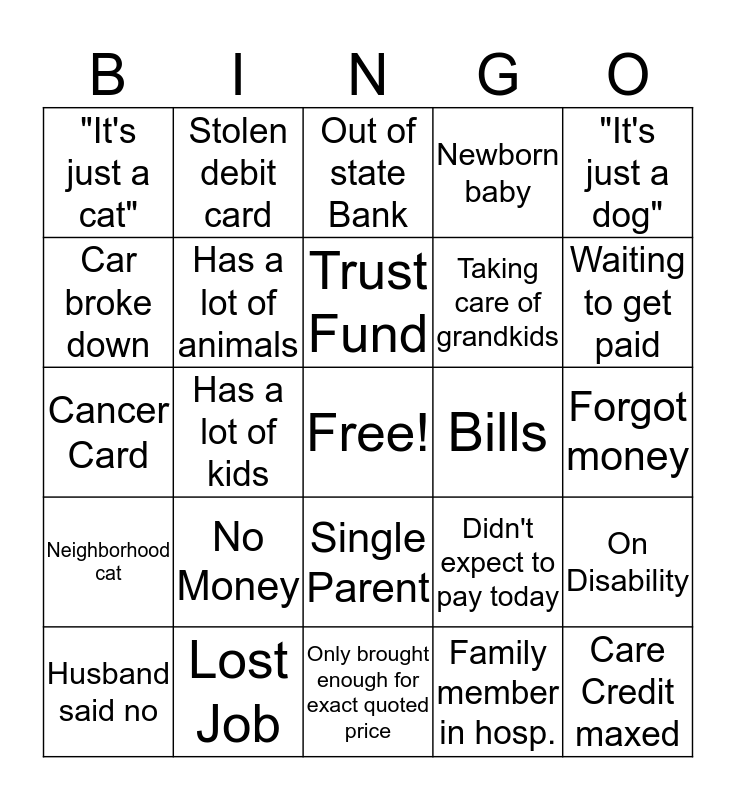 This bingo card has a free space and 24 words: No Money, Lost Job, Trust Fund, Husband said no, "It's just a dog", "It's just a cat", Car broke down, Stolen debit card, Bills, Single Parent, Taking care of grandkids, Cancer Card, Didn't expect to pay today, On Disability, Has a lot of animals, Family member in hosp., Forgot money, Out of state Bank, Waiting to get paid, Has a lot of kids, Care Credit maxed, Neighborhood cat, Newborn baby and Only brought enough for exact quoted price.