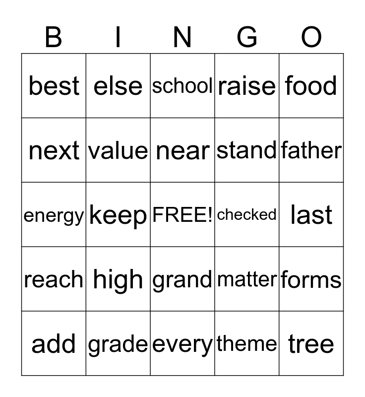 This bingo card has a free space and 25 words: high, every, near, add, food, best, next, else, checked, grand, stand, energy, matter, forms, value, notation, last, school, father, keep, tree, grade, reach, raise and theme.