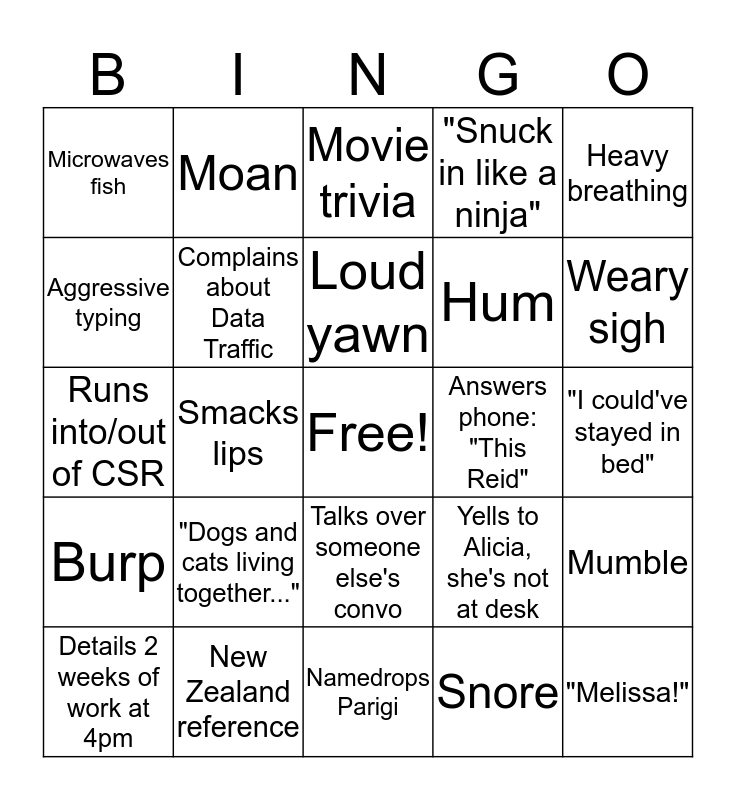 This bingo card has a free space and 24 words: "Dogs and cats living together...", New Zealand reference, Loud yawn, Details 2 weeks of work at 4pm, Heavy breathing, Microwaves fish, Aggressive typing, Moan, Answers phone: "This Reid", Talks over someone else's convo, Hum, Runs into/out of CSR, Yells to Alicia, she's not at desk, Mumble, Complains about Data Traffic, Snore, "I could've stayed in bed", Movie trivia, Weary sigh, Smacks lips, "Melissa!", Burp, "Snuck in like a ninja" and Namedrops Parigi.