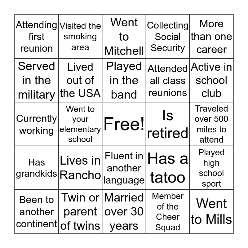This bingo card has a free space and 24 words: Lives in Rancho, Twin or parent of twins, Played in the band, Been to another continent, More than one career, Attending first reunion, Served in the military, Visited the smoking area, Is retired, Fluent in another language, Attended all class reunions, Currently working, Has a tatoo, Played high school sport, Lived out of the USA, Member of the Cheer Squad, Traveled over 500 miles to attend, Went to Mitchell, Active in school club, Went to your elementary school, Went to Mills, Has grandkids, Collecting Social Security and Married over 30 years.