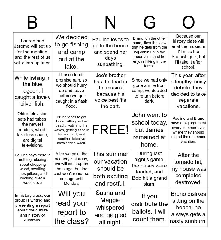 This bingo card has a free space and 24 words: After we paint the scenery Saturday, we will set it up on the stage, but the cast won't rehearse onstage until Monday., Will you read your report to the class?, Joe's brother has the lead in the musical because his voice best fits the part., In history class, our group is writing and presenting a report about the culture and history of Australia., Because our history class will be at the museum, I'll miss the Spanish quiz, but I'll take it after school., Lauren and Jerome will set up for the meeting, and the rest of us will clean up later., While fishing in the blue lagoon, I caught a lovely silver fish., We decided to go fishing and camp out at the lake., John went to school today, but James remained at home., This summer our vacation should be both exciting and restful., Since we had only gone a mile from camp, we decided to return before dark., Older television sets had tubes; the newest models, which take less space, are digital televisions., During last night's game, the bases were loaded, and Bob hit a grand slam., After the tornado hit, my house was completed destroyed., Those clouds promise rain, so we should hurry up and leave before we get caught in a flash flood., If you distribute the ballots, I will count them., Pauline and Bruno have a big argument every summer over where they should spend their summer vacation., Pauline loves to go to the beach and spend her days sunbathing., This year, after a lengthy, noisy debate, they decided to take separate vacations., Bruno tends to get bored sitting on the beach, watching the waves, getting sand in his swimsuit, and reading detective novels for a week., Bruno dislikes sitting on the beach; he always gets a nasty sunburn., Pauline says there is nothing relaxing about chopping wood, swatting mosquitoes, and cooking over a woodstove, Bruno, on the other hand, likes the view that he gets from the log cabin up in the mountains, and he enjoys hiking in the forest. and Sasha and Maggie whispered and giggled all night..
