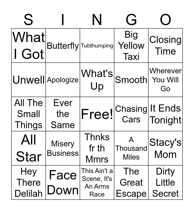 This bingo card has a free space and 29 words: Hey There Delilah, This Love, Ever the Same, Torn, What I Got, Tubthumping, Apologize, Misery Business, Chasing Cars, Face Down, It Ends Tonight, Dirty Little Secret, This Ain't a Scene, It's An Arms Race, The Great Escape, Wherever You Will Go, Just the Girl, Thnks fr th Mmrs, All Star, Closing Time, All The Small Things, A Thousand Miles, Check Yes, Juliet, Smooth, Unwell, Big Yellow Taxi, Butterfly, Stacy's Mom, What's Up and Absolutely (Story of a Girl).