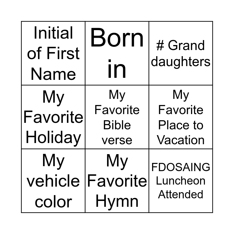 This bingo card has 9 words: My vehicle color, # Grand daughters, Born in, My Favorite Holiday, Initial of First Name, My Favorite Place to Vacation, My Favorite Bible verse, FDOSAING Luncheon Attended and My Favorite Hymn.