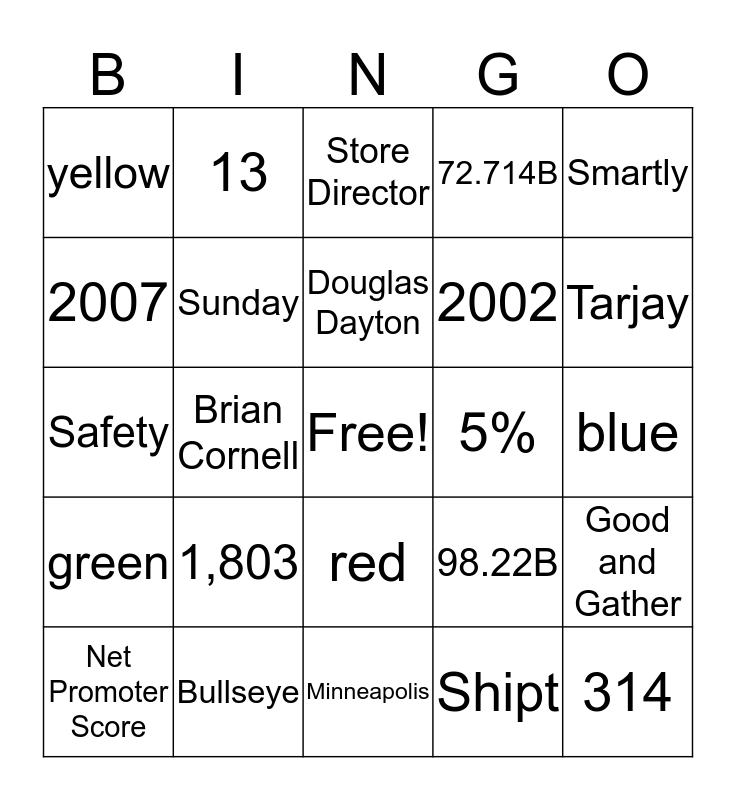 This bingo card has a free space and 28 words: Good and Gather, 3, 2002, Shipt, 2007, Store Director, 13, green, 5%, Net Promoter Score, Safety, 72.714B, Bullseye, Minneapolis, Tarjay, 1902, 1,803, Sunday, Douglas Dayton, red, yellow, Workday, 314, Brian Cornell, blue, 98.22B, Smartly and 14.