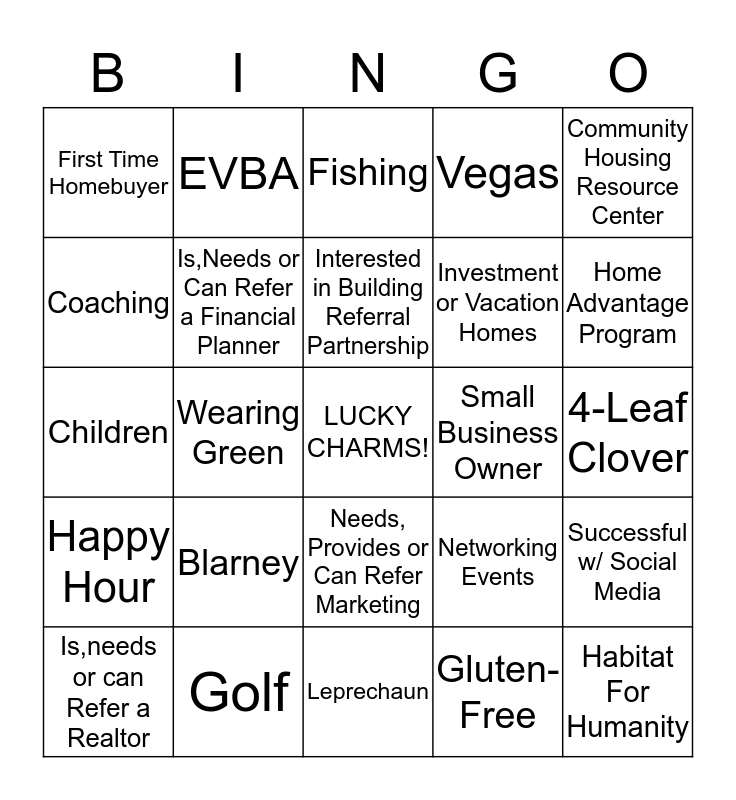 This bingo card has a free space and 24 words: Blarney, Golf, Interested in Building Referral Partnership, Is,needs or can Refer a Realtor, Community Housing Resource Center, First Time Homebuyer, Coaching, EVBA, Small Business Owner, Needs, Provides or Can Refer Marketing, Investment or Vacation Homes, Children, Networking Events, Successful w/ Social Media, Is,Needs or Can Refer a Financial Planner, Gluten-Free, 4-Leaf Clover, Fishing, Home Advantage Program, Wearing Green, Habitat For Humanity, Happy Hour, Vegas and Leprechaun.