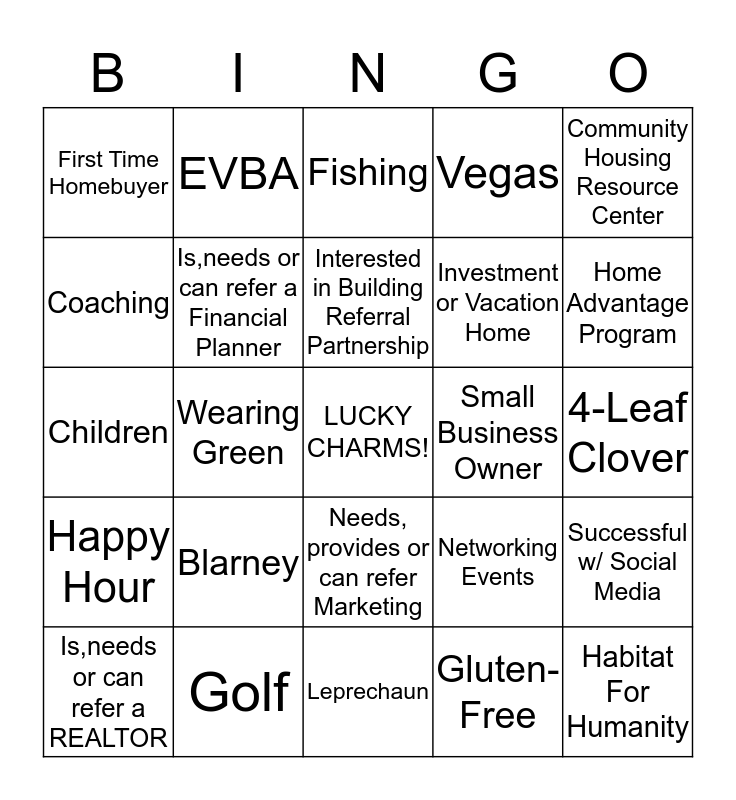 This bingo card has a free space and 24 words: Blarney, Golf, Interested in Building Referral Partnership, Is,needs or can refer a REALTOR, Community Housing Resource Center, First Time Homebuyer, Coaching, EVBA, Small Business Owner, Needs, provides or can refer Marketing, Investment or Vacation Home, Children, Networking Events, Successful w/ Social Media, Is,needs or can refer a Financial Planner, Gluten-Free, 4-Leaf Clover, Fishing, Home Advantage Program, Wearing Green, Habitat For Humanity, Happy Hour, Vegas and Leprechaun.
