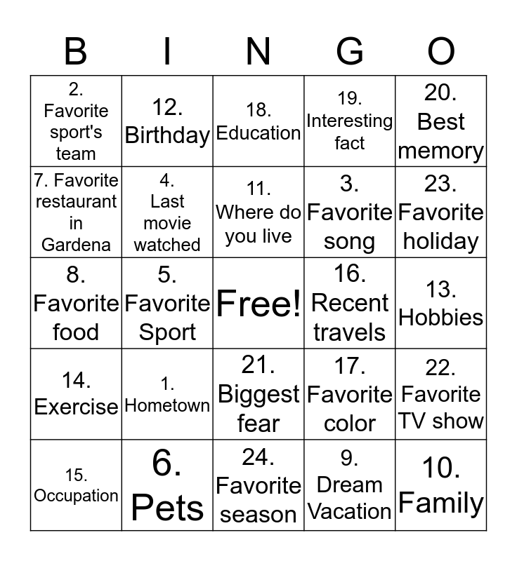 This bingo card has a free space and 24 words: 1. Hometown, 6. Pets, 11. Where do you live, 15. Occupation, 20. Best memory, 2. Favorite sport's team, 7. Favorite restaurant in Gardena, 12. Birthday, 16. Recent travels, 21. Biggest fear, 3. Favorite song, 8. Favorite food, 17. Favorite color, 22. Favorite TV show, 4. Last movie watched, 9. Dream Vacation, 13. Hobbies, 18. Education, 23. Favorite holiday, 5. Favorite Sport, 10. Family, 14. Exercise, 19. Interesting fact and 24. Favorite season.