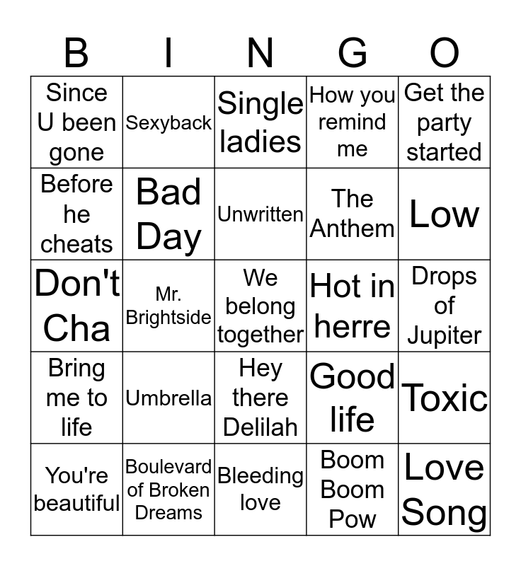 This bingo card has 45 words: Yeah!, We belong together, Gold digger, You're beautiful, Sk8er Boi, Boom Boom Pow, Single ladies, Drop it like it's hot, Get the party started, Boulevard of Broken Dreams, How you remind me, Hot in herre, Hey there Delilah, Umbrella, Beautiful Day, Bleeding love, Fallin', Don't Cha, Viva la vida, Low, Sexyback, Hot n' cold, Hollaback girl, Since U been gone, Use Somebody, Drops of Jupiter, Whatever you like, Just dance, Good life, Bring me to life, Crank that (Soulja Boy), Toxic, Beautiful Girls, Pumped up kicks, Breakeven, Mr. Brightside, Fireflies, Give me everything, Love Song, Unwritten, Before he cheats, The Anthem, Numb, Bad Day and Whenever, Wherever.