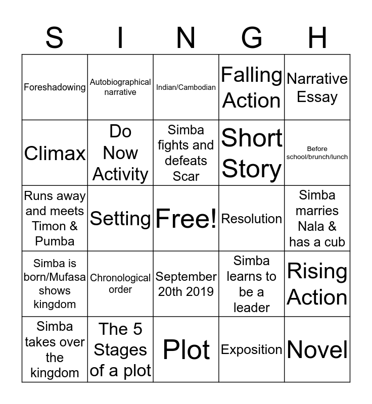 This bingo card has a free space and 24 words: Chronological order, The 5 Stages of a plot, Simba fights and defeats Scar, Simba takes over the kingdom, Narrative Essay, Foreshadowing, Climax, Autobiographical narrative, Resolution, September 20th 2019, Short Story, Runs away and meets Timon & Pumba, Simba learns to be a leader, Rising Action, Do Now Activity, Exposition, Simba marries Nala & has a cub, Indian/Cambodian, Before school/brunch/lunch, Setting, Novel, Simba is born/Mufasa shows kingdom, Falling Action and Plot.