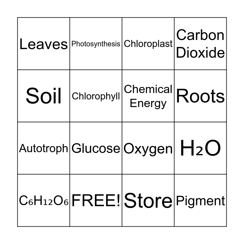 This bingo card has 27 words: Biotic, Abiotic, Autotroph, Heterotroph, Chlorophyll, Chloroplast, Photosynthesis, Pigment, FREE!, Stomata, Oxygen, Carbon Dioxide, Convert, Relsease, Glucose, Solar Energy, Chemical Energy, Roots, Stem, Leaves, Store, Sugar, H₂O, C₆H₁₂O₆, CO₂, Soil and Carbon Cycle.
