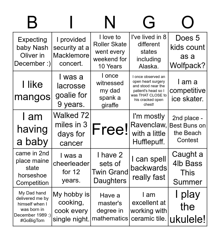 This bingo card has a free space and 63 words: Broken my collarbone twice in the same place., I can touch my nose with my tongue., I Drove a 69 Mustang Mach 1 when I was 18 Years Old., Caught a 4lb Bass This Summer, I have 7 tattoos, I used to work in Archaeology, I provided security at a Macklemore concert., I don't eat blue M&Ms., I once witnessed my dad spank a giraffe, I almost always have a "dad" joke ready, I have 2 sets of Twin Grand Daughters, Scared of the dark - Like Star gazing, 2nd place - Best Buns on the Beach Contest, Does 5 kids count as a Wolfpack?, I was a "semi" competitive gamer for money., I like mangos, Walked 72 miles in 3 days for cancer, Expecting baby Nash Oliver in December :), I love to fish and hunt, I once observed an open heart surgery and stood near the patient's head so I was THAT CLOSE to his cracked open chest!, I was a cheerleader for 12 years., came in 2nd place maine state horseshoe Competition, I've lived in 8 different states including Alaska., Had spikey red/auburn hair, Just bought a house!, Spent two weeks in Soviet Union in 1988., My uncle worked on the Manhattan Project., I love the paranormal, Caught a blue marlin while on vacation in Cozumel, New England Wrestling Champion in PeeWees, I was the youngest weather observer in Maine., Love going to the beach on my scooter!, I LOVE crafty / DIY projects., Won 8 consecutive state championships in youth racewalking., I am a competitive ice skater., My Dad hand delivered me by himself when I was born in December 1989 :) #GoBigTom, My nickname is Appalacian Jim, I am excellent at working with ceramic tile., I have lived in Europe and Asia., I was a lacrosse goalie for 9 years., I am having a baby, I'm mostly Ravenclaw, with a little Hufflepuff., Was a coach/umpire in the World Series, I have 6 boys, I play the ukulele!, My hobby is cooking, cook every single night., I owned a chocolate tri-pod, I can spell backwards really fast, I like to skateboard, Competed in karate tournaments as a child, I share a birthday with Beyoncé., Have a master's degree in mathematics, I'm the co-chair for NNE&UNY Regional Diversity Council., A customer called me a chipmunk on crack., I'm a huge fan of SOV horror films., I love to Roller Skate went every weekend for 10 Years, This year is my 20th year at TD Bank, I won hot-wing eating contest in VancouverBC!!, Winter hobbies include Ice Fishing, and Stained Glass., First concenert was Def Leopard and REO Speedwagon, My oldest sibling is 23 years older than I am, I have a twin sister and Named after the actor who played Saruman in Lord of the Rings.