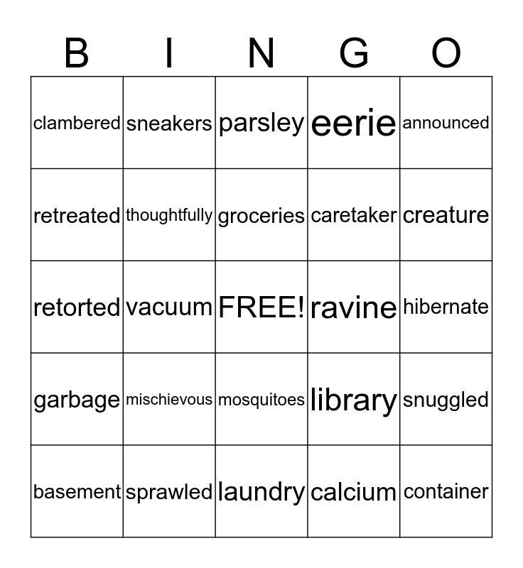 This bingo card has a free space and 24 words: mischievous, sprawled, groceries, basement, announced, clambered, retreated, sneakers, ravine, mosquitoes, caretaker, retorted, library, snuggled, thoughtfully, calcium, hibernate, parsley, creature, vacuum, container, garbage, eerie and laundry.