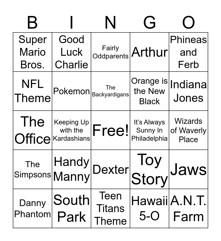 This bingo card has a free space and 24 words: Handy Manny, South Park, The Backyardigans, Danny Phantom, Phineas and Ferb, Super Mario Bros., NFL Theme, Good Luck Charlie, It’s Always Sunny In Philadelphia, Dexter, Orange is the New Black, The Office, Toy Story, Jaws, Pokemon, Hawaii 5-O, Wizards of Waverly Place, Fairly Oddparents, Indiana Jones, Keeping Up with the Kardashians, A.N.T. Farm, The Simpsons, Arthur and Teen Titans Theme.