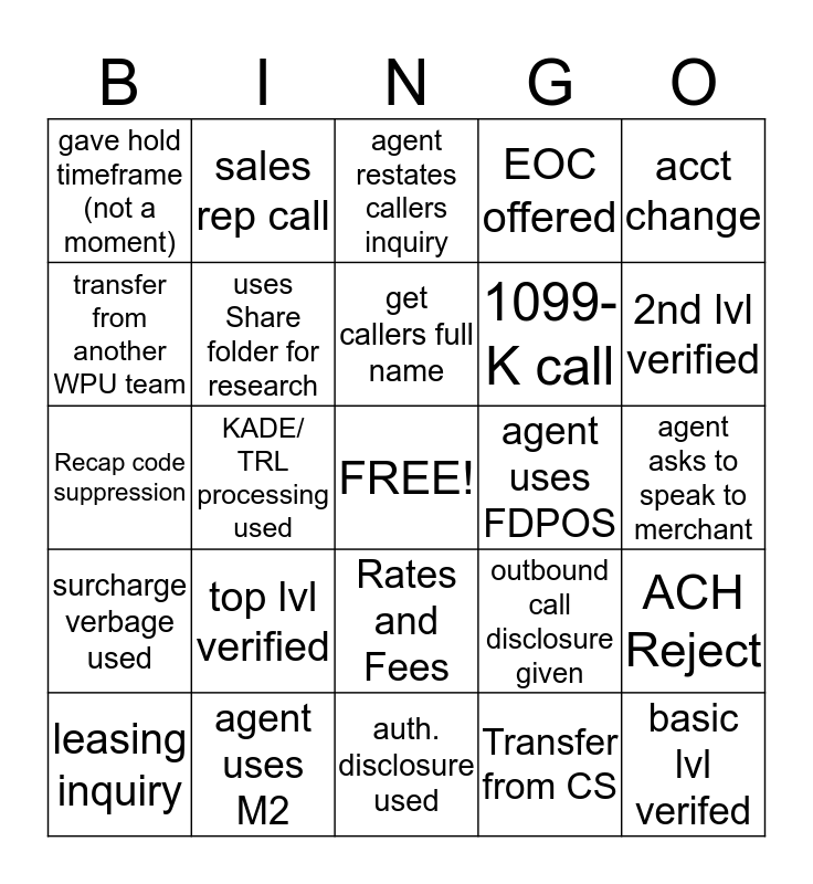 This bingo card has a free space and 24 words: top lvl verified, agent uses M2, get callers full name, leasing inquiry, acct change, gave hold timeframe (not a moment), transfer from another WPU team, sales rep call, agent uses FDPOS, Rates and Fees, 1099-K call, Recap code suppression, outbound call disclosure given, ACH Reject, uses Share folder for research, Transfer from CS, agent asks to speak to merchant, agent restates callers inquiry, 2nd lvl verified, KADE/ TRL processing used, basic lvl verifed, surcharge verbage used, EOC offered and auth. disclosure used.